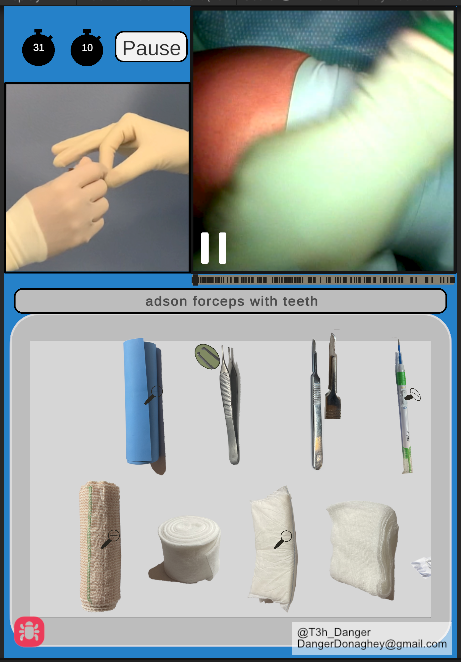IDS hired me to build scrub training modules that could be run on an iPad, MAC, PC, or in a VR headset (like Quest 3). The user is in a virtual operating room, with a virtual table of instruments, and a virtual surgeon with their hand out. A voice asks for the instruments in order, while the user can see a video of the surgical field. See the image of the iPad version, shown here.