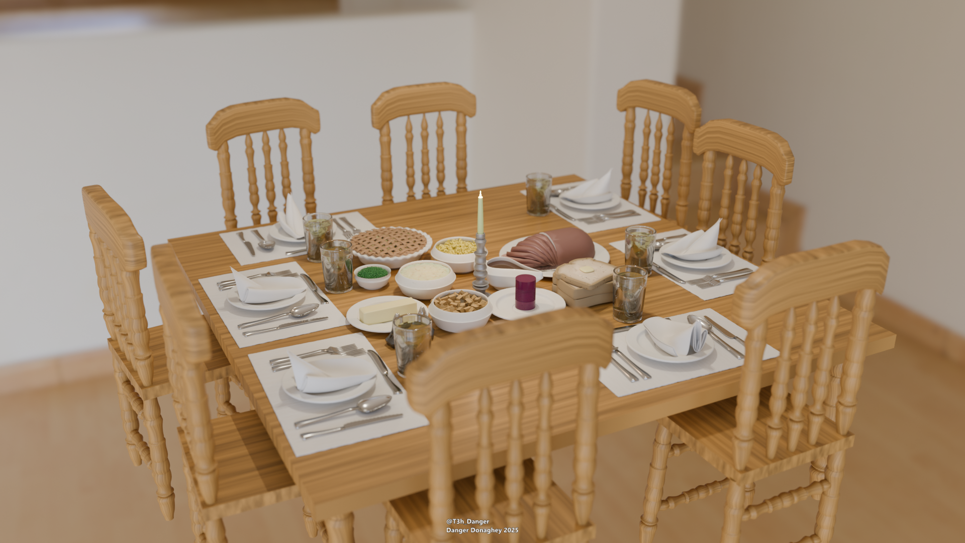 The holidays are a warm time filled with friends and family connecting over warm lovingly made food. This render tries to capture the feeling of an inviting table that has a place set for you!