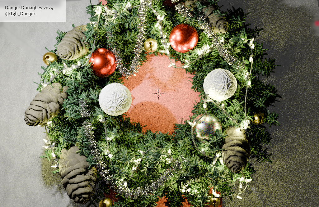 A fully procedural scene depicting a festive holiday wreath. The entire scene was created in Blender using Geometry Nodes.